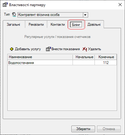 Якщо споживання обчислюється за показаннями лічильника, у картці кожного абонента перейти на вкладку "Біллінг" та внести свідчення